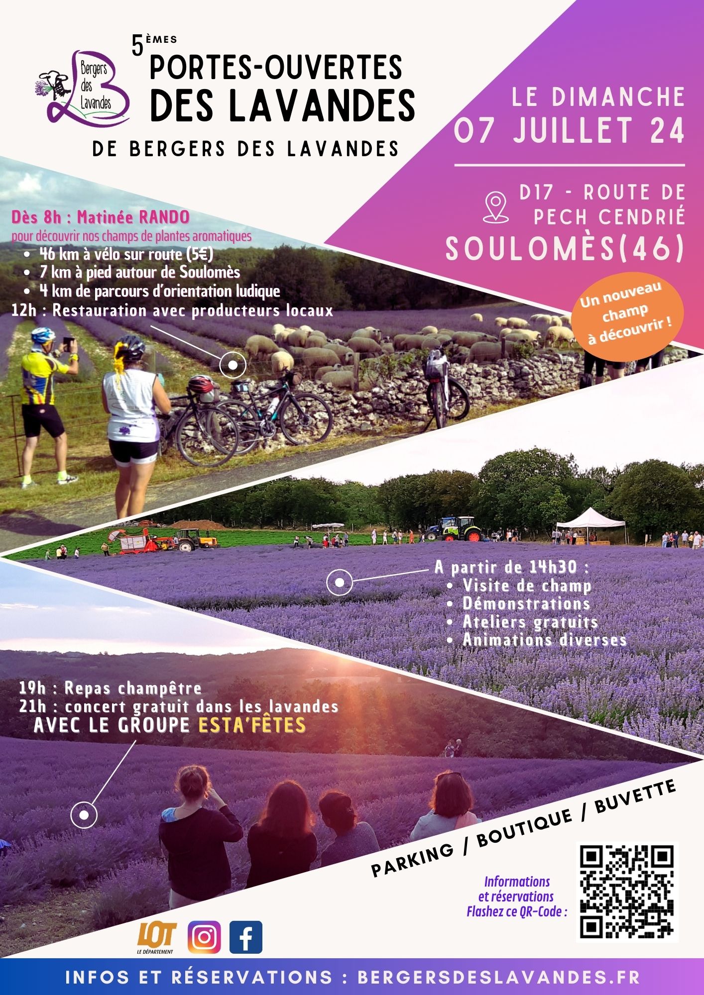 Cette année la matinée sera sportive avec une randonnée vélo, l’après-midi sera récréatif et instructif avec une visite guidée des champs de lavande, et la soirée sera musicale avec un repas puis un concert dans les lavandes, tout cela sur la commune de Lauzès (46360).